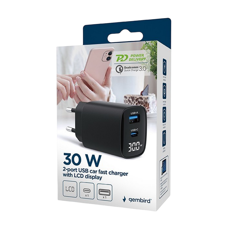 Încărcător Gembird TA-UC-PDQC30LCD-BK-01, 30W, Negru